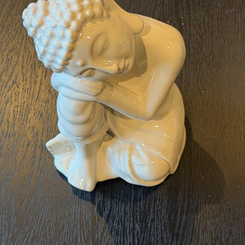 Buddha hode dekorasjon i hvit keramikk. Figuren forestiller et stilisert Buddha-hode med tydelige ansiktstrekk og håroppsatser. Passer som innredningsdetalj i stue, soverom eller andre rom der man ønsker et rolig og enkelt uttrykk. Kan plasseres på hylle, bord eller vinduskarm som dekorativt element.