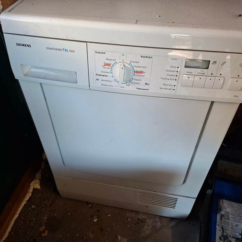 Eldre tørketrommel selges. Må byttes drivreim som begynner å bli slitt. Den "slurer" litt hvis du tar for mye klær. Ny reim koster ca 3-400kr. Den ble byttet sist for ca 6 år siden og er en helt grei jobb Ellers fungerer den fint. 👍