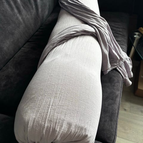 Selger min bbhugme gravidpute, brukt i 2 svangerskap. Den er hel og fin, bortsett fra noen hull i trekket (se bilde). Har ingenting å si for bruken. Trekket er nyvasket (40 grader med blenda sensitive).