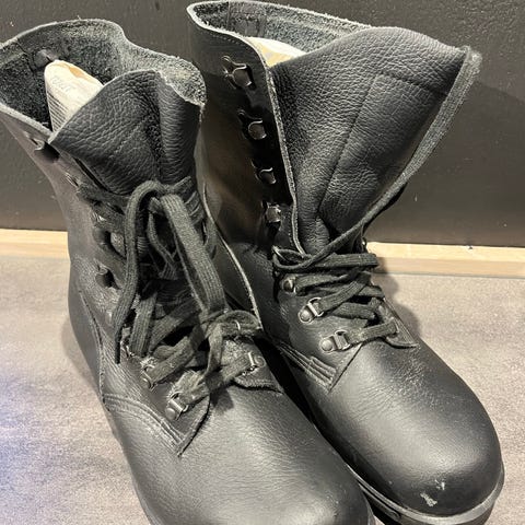 Alfa M77 skinnstøvler. Militærstøvler av god kvalitet. Disse er godt brukt, men hele og pene og tatt godt vare på og det er mye bruk igjen.
