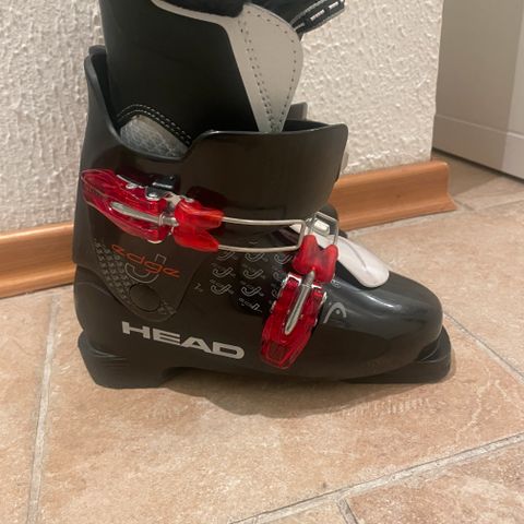 Head alpinstøvler for barn i størrelse 230–235 mm. Støvlene har hard ytterskall i plast med fire justerbare spenner i metall/plast for god tilpasning rundt fot og legg. Fargekombinasjon svart, grå og gul med røde detaljer. Myk innerstøvel gir isolasjon og komfort. Sålen er merket med DIN ISO-standard (DIN ISO 5355) og er egnet for bruk med vanlige alpinbindinger.