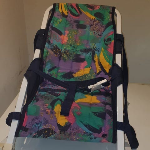 Stokke vippestol i blå tekstil. Vippestolen har polstret sete og justerbare seler for å holde barnet på plass. Trekket er avtakbart. Nyfødtdel medfølger.