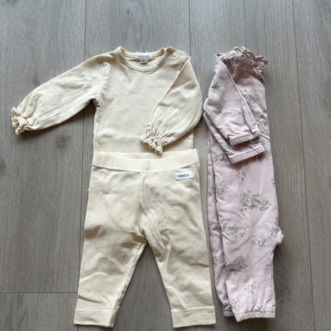 Den grå buksen er i størrelse 68. Alt annet passer til babyer rundt 2-4 måneder.