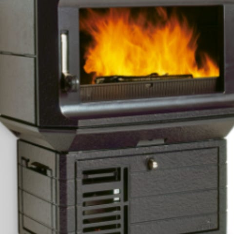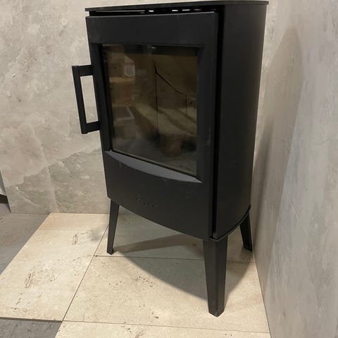 Frittstående vedovn i svart stål. Ovnen har rektangulær form med stor glassdør som gir innsyn til ildstedet. Brennkammeret er kledd med lys ildfast stein og har rist i bunnen. Under brennkammeret er det et lukket rom som kan brukes til oppbevaring av tilbehør. Røykrøret er toppmontert. Passer til oppvarming av oppholdsrom der det er tilkoblingsmulighet til pipe og egnet gulvplate under ovnen.