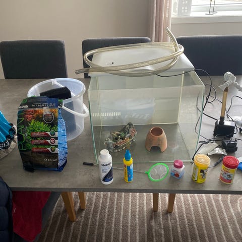 Akvarium med tilbehør, inkludert dekorasjoner, filter og diverse utstyr. Settet inneholder glassakvarium, innvendig filterpumpe, varmeelement, bøtte, håver, slange til vannbytte og ulike vannbehandlingsmidler. I tillegg følger det med flere typer fiskefôr i bokser og flasker.