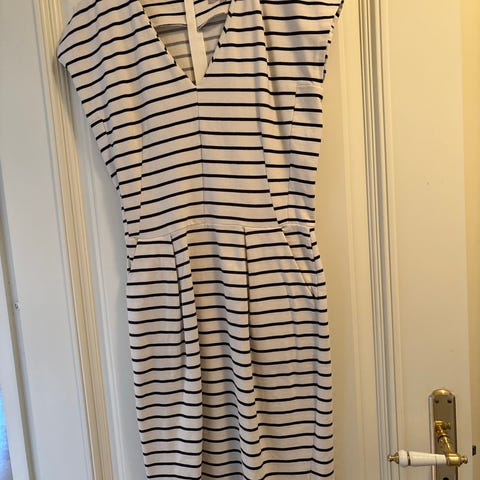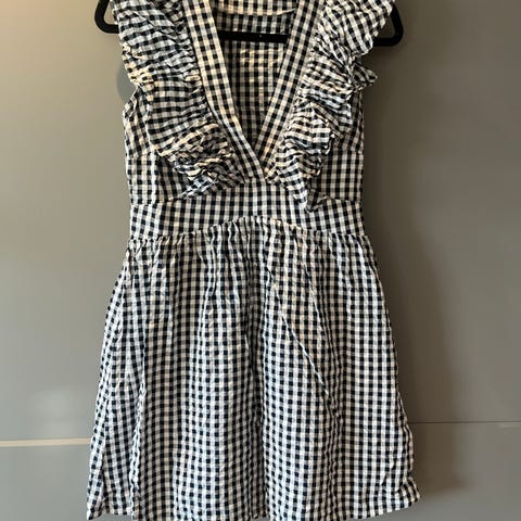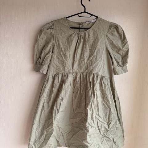 Sommerkjole for dame i størrelse S. Kjolen er grønn og laget av bomull. Modellen har korte puffede ermer, rund hals og markert midje med strikk. Skjørtet har flere volanger/lag som gir et lett og luftig uttrykk. Passer til bruk på varme dager, hverdags og enkle anledninger.