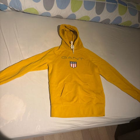 Gant hettegenser i grå bomull for herre i størrelse S. Genseren har hette med snor, ribbekanter nederst og på ermene, samt kengurulomme foran. På brystet er det Gant-logo med skjoldmotiv. Materialet er bomull, som gir et mykt og behagelig plagg egnet til hverdagsbruk. Størrelseslappen viser 176 cm / 16 years, som tilsvarer en smal passform rundt herre størrelse S, avhengig av kroppsfasong.