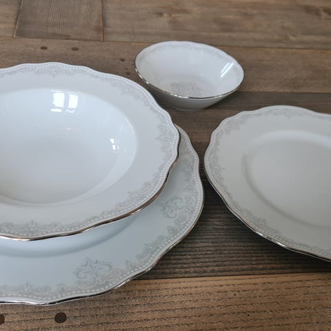 Stavanger flint Serveringsfat m/gullkant, Rundt fat diameter 34 cm, noe krakkelert. Ovalt fat 33.5 x 25 cm lite skår på undersiden, se bilde. Rund bolle 22 cm. Sausenebb 24 cm. Selges kr 800.