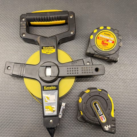 To originale Tajima målebånd selges samlet. Ett kompakt 10 m glassfiberbånd (Symron-S) og ett 30 m bånd på snelle (Symron-R) med håndtak. Solide kvalitetsverktøy for oppmåling ute og inne. Fremstår i pen stand.