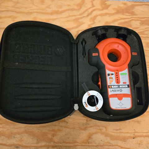 Original Black & Decker stenderfinner med laserfunksjon, for lokalisering av stendere bak vegg. Leveres komplett i polstret etui med tilbehør, slik avbildet. Pent brukt og fremstår funksjonell.