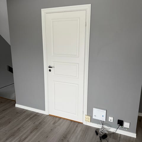 Innerdør med karm i hvit utførelse. Døren har enkel, glatt front og er montert i skråvegg. Passer som adkomstdør til bod, knevegg eller mindre rom. Gulvet rundt er lyst laminat eller parkett, og veggene er malt i en grå farge, noe som kan være relevant ved tilpasning til eksisterende interiør.