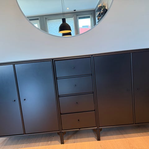 Skjenken er original innvendig, men utsiden er sprøytemalt i dempet sort, med silkematt lakk over. Et nydelig møbel!