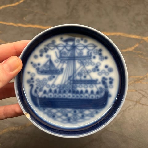 Porsgrund lite blått porselensfat med vikingskip – ca. 1980 – norsk minnefat