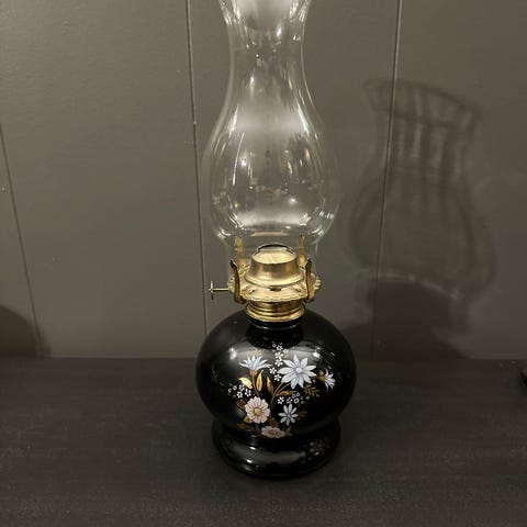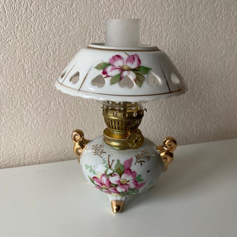 Fin lampe med brenner of veke som kan reguleres opp og ned, men den mangler brennerglass.