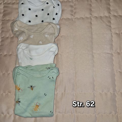 Selger en liten klespakke med 2 kortermete bodyer og 2 bukser. Den rosa bukse er i størrelse 68. Alt annet er i 62/68 (de bildene).