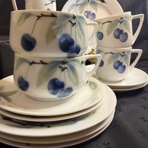 Alle er hele og uten skader bortsett fra en kopp/sprekk og limt (blå blomster) ellers pent og fint brukt.
