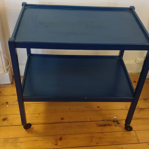 Noe skjolder på bordplaten som sikkert kan vaskes vekk. Står på hjul.