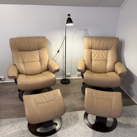 Selger våre Brunstad lenestoler i brunt (nougat) i skinn med sving og vipp, inkludert fotskamler. 4 år gamle med garantibevis. Ny pris for 4 år siden var 55000kr.