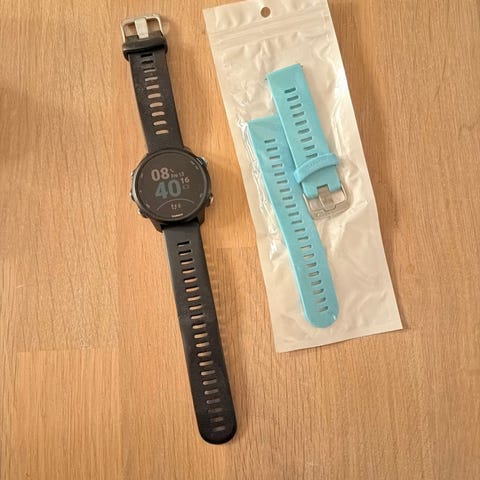 Garmin Forerunner 245 pulsklokke i svart. Veldig god til løping, tur og annen trening. En del slitasje på reim og et par flekker på skjermen, men ikke noen feil som påvirker funksjonen. Selges uten lader.