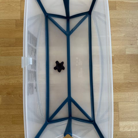 Stokke Flexi Bath L babybadekar transparent/grønn. Sammenleggbart badekar som kan foldes flatt for enkel oppbevaring og transport. Badekaret har propp i bunnen for tapping av vann og glatte innvendige flater som er enkle å rengjøre. Egnet til bading av spedbarn og små barn i hjemmet eller på reise.
