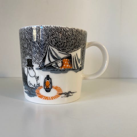 Tøff barnekopp med Mummitrollet som Tarzan i jungelen på. Fra 2013. Dobbelt hank for godt gripetak og solid porselen. Høyde 7 cm. Meget pent brukt, ingen skader