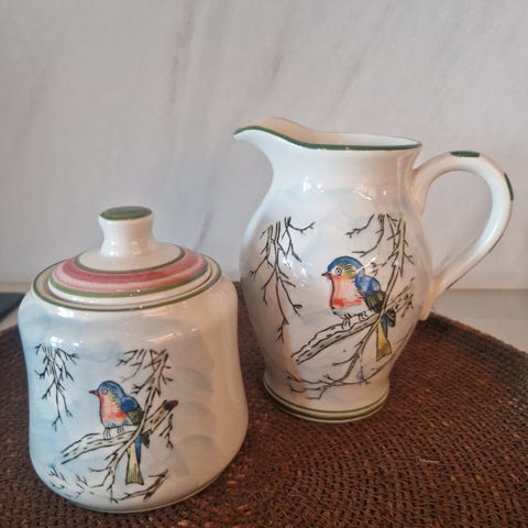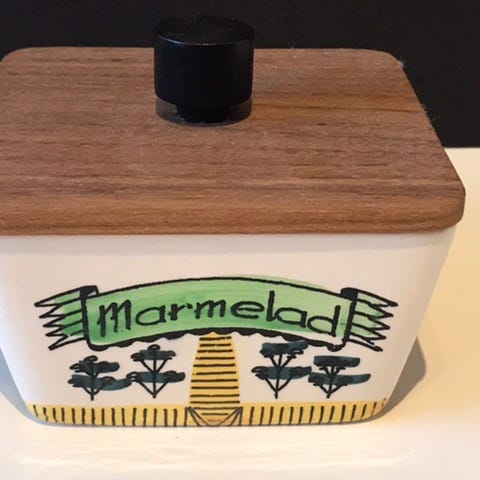 Krukken er hel, blank og fin. Lokket kan kanskje få et nytt lag med lakk, om ønskelig.