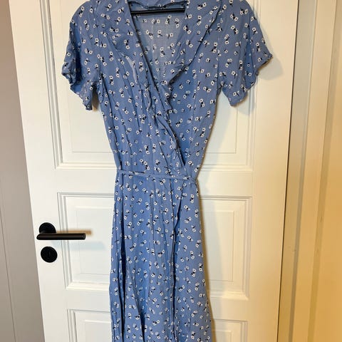 Floyd sommerkjole for dame i størrelse S. Kjolen er blå med blomstermønster og er laget i polyester. Den har omslagsoverdel med V-utringning, korte vide ermer og knytebelte i livet. Lengden går omtrent til leggen, og passformen er rett med innstramming i midjen. Egner seg som lett sommerkjole til hverdagsbruk eller enkle anledninger.