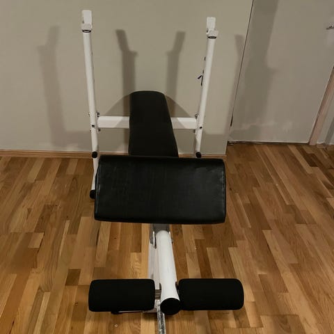Justerbar treningsbenk i svart farge. Benken har polstret rygg- og sittepute samt støtte foran for ben eller hofte. Egnet til ulike styrkeøvelser som mage, rygg og bein, og kan brukes hjemme i treningsrom eller stue. Stabil konstruksjon med metallramme og myke puter for økt komfort under trening.