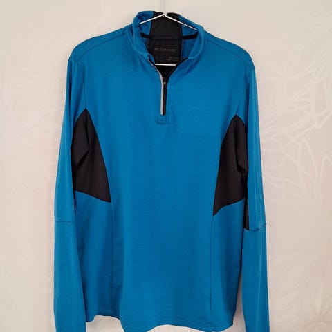 McKinley langermet genser for herre i størrelse XXL. Genseren har halv glidelås i halsen og er tofarget i blått med svarte sidepaneler. Passer til ulike fritids- og sportsaktiviteter. Materialet fremstår som lett og glatt syntetisk stoff som tørker raskt og gir god bevegelsesfrihet. Egnet som ytterste lag i mildt vær eller som mellomlag under jakke.