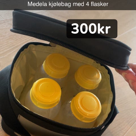 Medela kjølebag for oppbevaring og transport av morsmelk. Settet består av en isolert kjøleveske i svart med glidelåslukking, formtilpasset kjøleelement og Medela-flasker med skrukork. Kjøleelementet legges i fryser før bruk og bidrar til å holde morsmelken kjølig over lengre tid. Vesken har bærestropp og er egnet til bruk hjemme, i barnehage eller på reise for trygg og praktisk lagring av pumpet morsmelk.