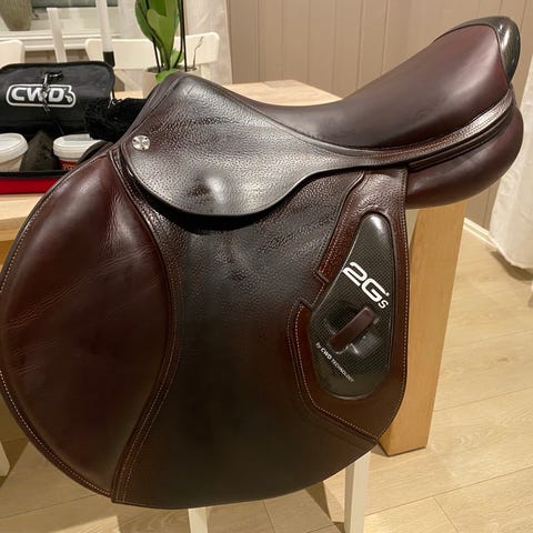 CWD 2Gs sprangsal i brunt lær. Salen har anatomisk utformede puter og fremskutte kapper tilpasset sprangridning. Salen gir god skulderfrihet og en fin sist for rytter. Panelene er utformet for å gi nær kontakt mellom rytter og hest. En teknisk god sprangsal.