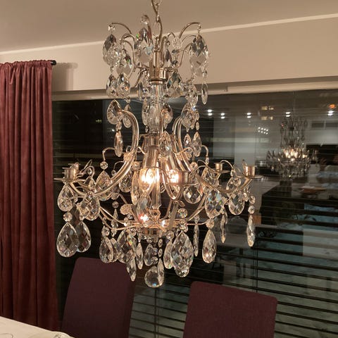 Elegant og klassisk lysekrone i glass, krystaller og kromfinish. Gir et fint og stemningsfullt lys og passer perfekt over spisebord, i stue eller gang.
