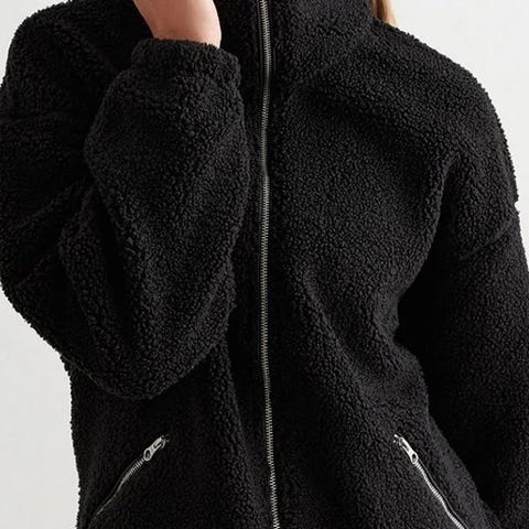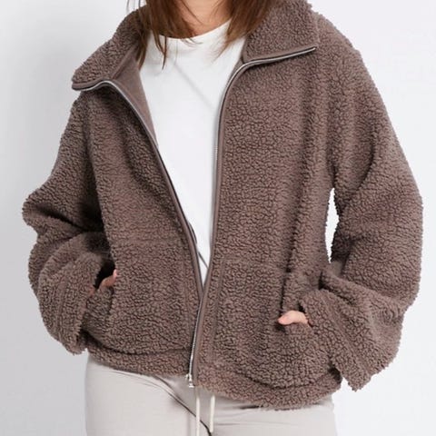 aim'n jakke for dame i størrelse S. Jakken er i beige polyester med myk, teddy-lignende overflate. Den har høy krage, hel glidelås i front og glidelåslommer i sidene. Ermene har elastisk avslutning, og jakken er noe lengre bak for ekstra dekning. Egner seg som yttertøy på kjølige dager eller som et ekstra lag under en ytterjakke.