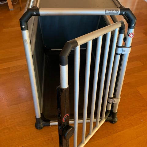 Herkules Milan hundebur i størrelse M. Buret er laget i aluminium med grå sider og sølvfargede stenger. Det er konstruert som et bilbur for hund, med skrå bakside tilpasset bagasjerom og dør foran med gitter.