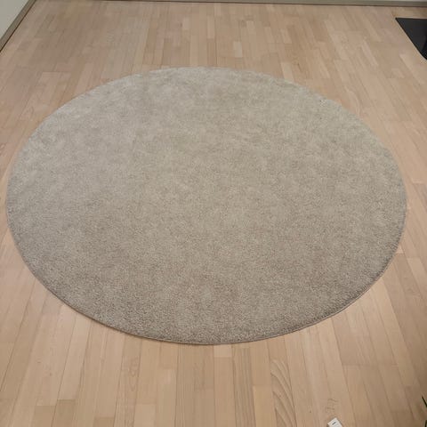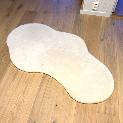 H&M Home teppe i organisk, asymmetrisk form. Teppet er i lys beige farge og laget av 100 % polyester. Størrelse 200 x 300 cm. Pent brukt uten flekker og ble kjøpt i nov. 2025