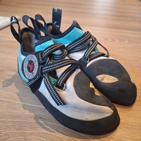 Skoene har borrelåslukking over vristen for enkel justering og av- og påtaking. Sålen er i gummi som gir friksjon mot klatreveggen. Passer til innendørs og utendørs klatring. Egnet for klatrere som ønsker en teknisk klatresko med presis passform.