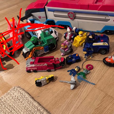 Skye – Paw Patrol-fly. Har batterier, kan snurre rundt, lyser og lager lyd. Leveres med figur og små deler som skytes ut fra vingene. Selges nå i butikk for rundt 700 kr.