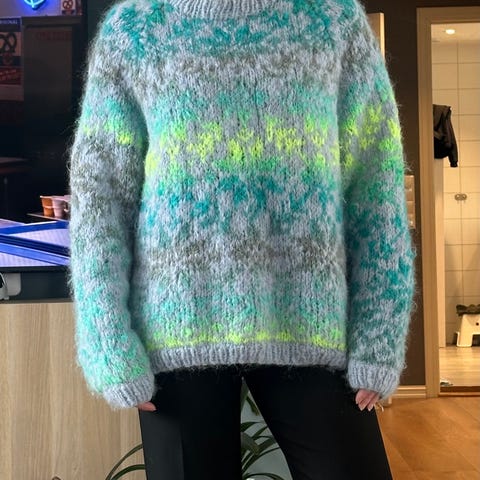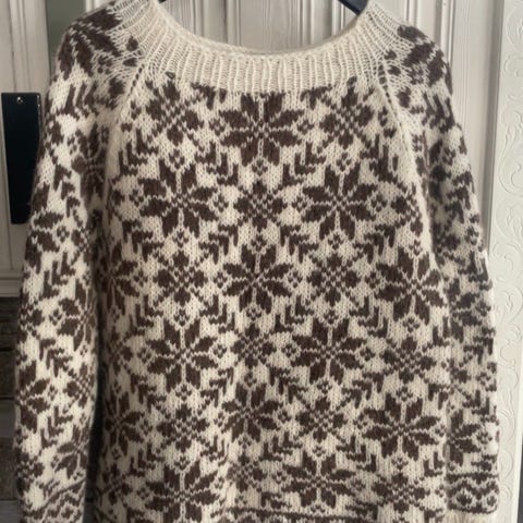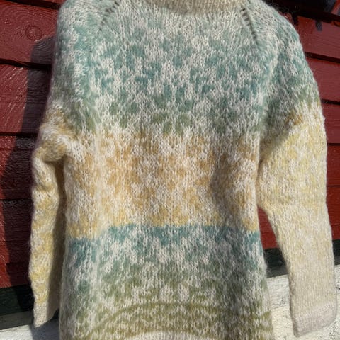 Hjemmestrikket Carly genser, strikket i originalgarnet fra oppskriften. Strikket i størrelse small, men er oversized så vil nokk passe alt mellom xs-m avhengig av ønsket passform