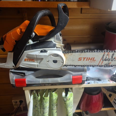 Pent brukt ryddesag med gresstrimmerhode, trekantblad, sagblad og bæresele selges.