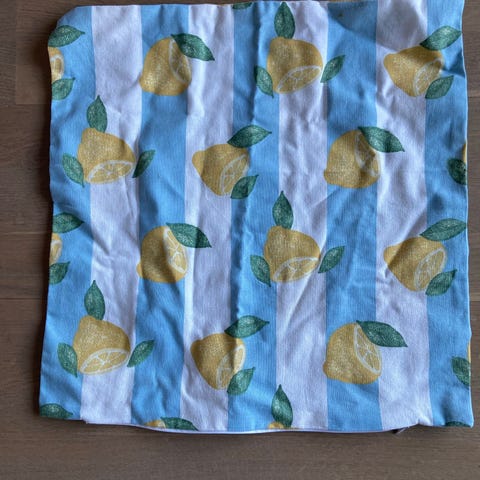 4 stk putetrekk, bomull, i rødt med hvitt blomsterprint. Stoffet har et gjennomgående mønster med små blomster og er egnet til bruk som gardin, duk, putetrekk eller annet interiørprosjekt. Vises brettet på bildene for å illustrere mengde og mønster. Det er glidelås og en åpning i stoffet på noen deler, som kan tyde på at det tidligere har vært brukt som putetrekk eller lignende.