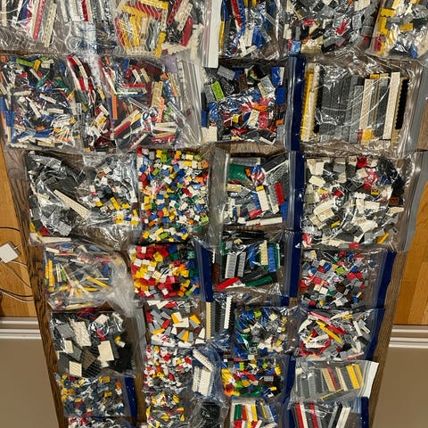 Den består av en større mengde løse LEGO-klosser i ulike farger og størrelser, samt flere baseplater med vei- og rundkjøringsmønster. Klosser og plater er en blanding fra ulike sett og temaer.