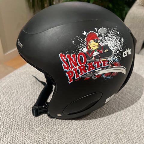 Scott Sno Pirate alpinhjelm i lilla farge med motiv på siden. Hjelmen har justerbar stramming bak og hakereim med klips. Leveres sammen med hvite skibriller med mørke glass som er festet med elastisk stropp rundt hjelmen. Egnet til alpint og annen vintersport for barn.