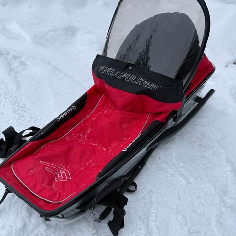 Det følger med ryggstøtte, solskjerm, formtilpasset liggeunderlag og Fjellpulken drag med sele. Det følger også med et Fjellpulken oppbevaringstrekk.