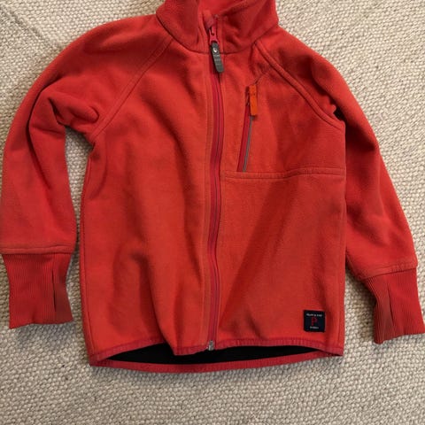 Polarn O. Pyret fleecejakke for barn i størrelse 104. Jakken er unisex og i oransje fleece-materiale. Den har glidelås i front og brystlomme med glidelås. Mansjettene har ribbestrikkede avslutninger. Passer til hverdagsbruk og som mellomlag under yttertøy for barn rundt 3–4 år.