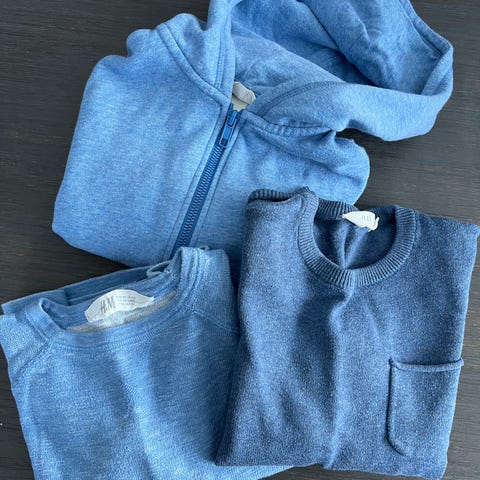 Mørkeblå trøye i samme str, veldig slitte mansjetter, spesielt på innsiden.