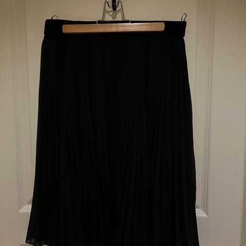 Benetton skjørt i ull for dame i størrelse M. Skjørtet er svart og har knapper foran samt belte i livet. Lengden går til omtrent kneet, og fasongen er rett og figurnær. Materialet i ull gjør plagget egnet til bruk i kjøligere vær, for eksempel til jobb, hverdag eller mer formelle anledninger sammen med bluse, genser eller jakke.
