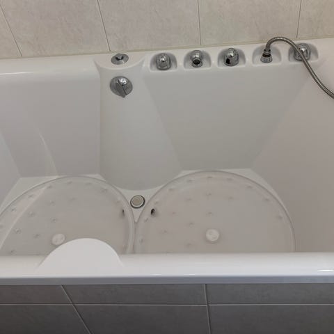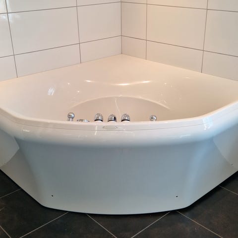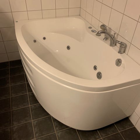 Hvit boblebadekar med innebygde massasjedyser i bunn og sider. Karet har integrert blandebatteri og hånddusj montert på karkanten.