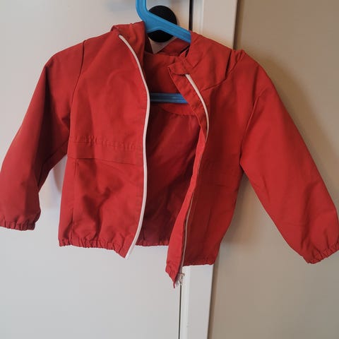 Jakken er rød, men fargen kan se litt lysere ut på bildene på grunn av kamera/lys. Det er en lett vår- og sommerjakke.