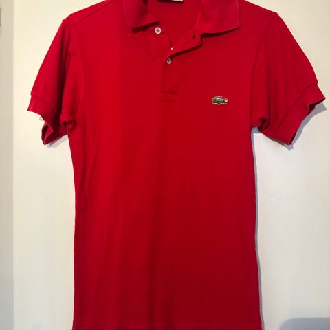 Lacoste skjorte for dame i størrelse S. Skjorten er blå med korte ermer og har kontraststriper i rødt og hvitt langs knappestolpen og på krage og ermekanter. Produsert i bomull. Klassisk polosnitt med krage og knappelukking foran, samt Lacoste-logo på brystet.