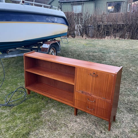 Pent (teak?)møbel med noe slitasje. De elektroniske komponentene er selvfølgelig ikke funksjonelle, men dette kan bli et flott skap for annet innhold. Må hentes.